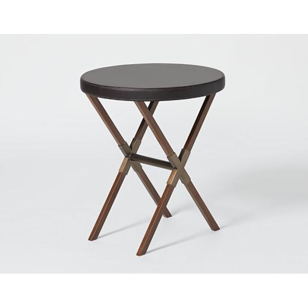 Antique brushed bronze metal base with upholstered leather top round hotel guestroom side table Images |